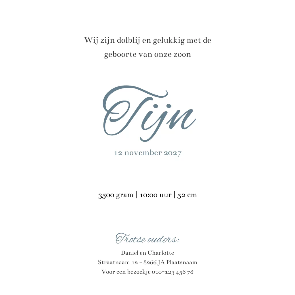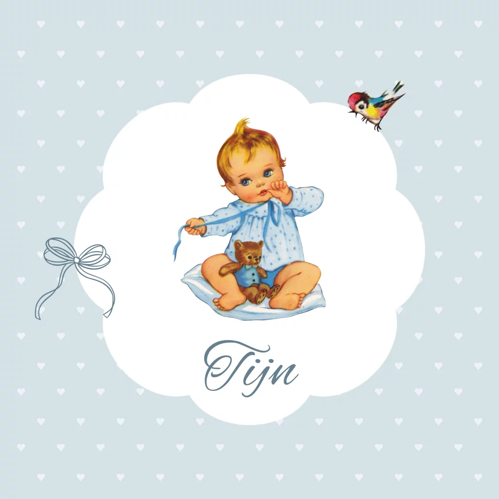 Lief geboortekaartje met nostalgisch plaatje van een baby jongetje op een kussen met zijn beertje en mooi gekleurd vogeltje. Pas zelf de teksten en de achtergrondkleur aan.