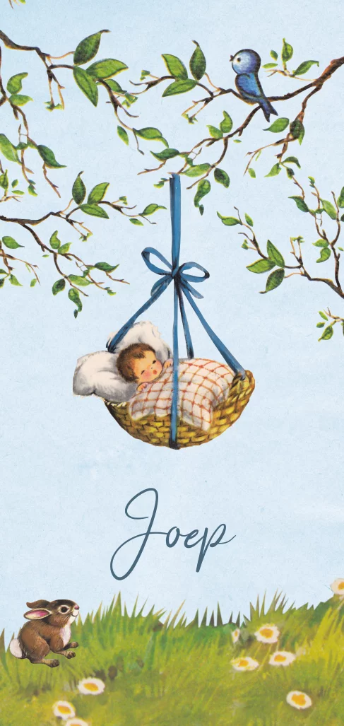 Lief geboortekaartje met blauw wiegje wat tussen de takken hangt. In het wiegje ligt een jongetje zoet te slapen. Met sierlijke blauwe typografie staat de naam van je pasgeboren zoontje voorop. Achterop kun je de teksten naar wens aanpassen.