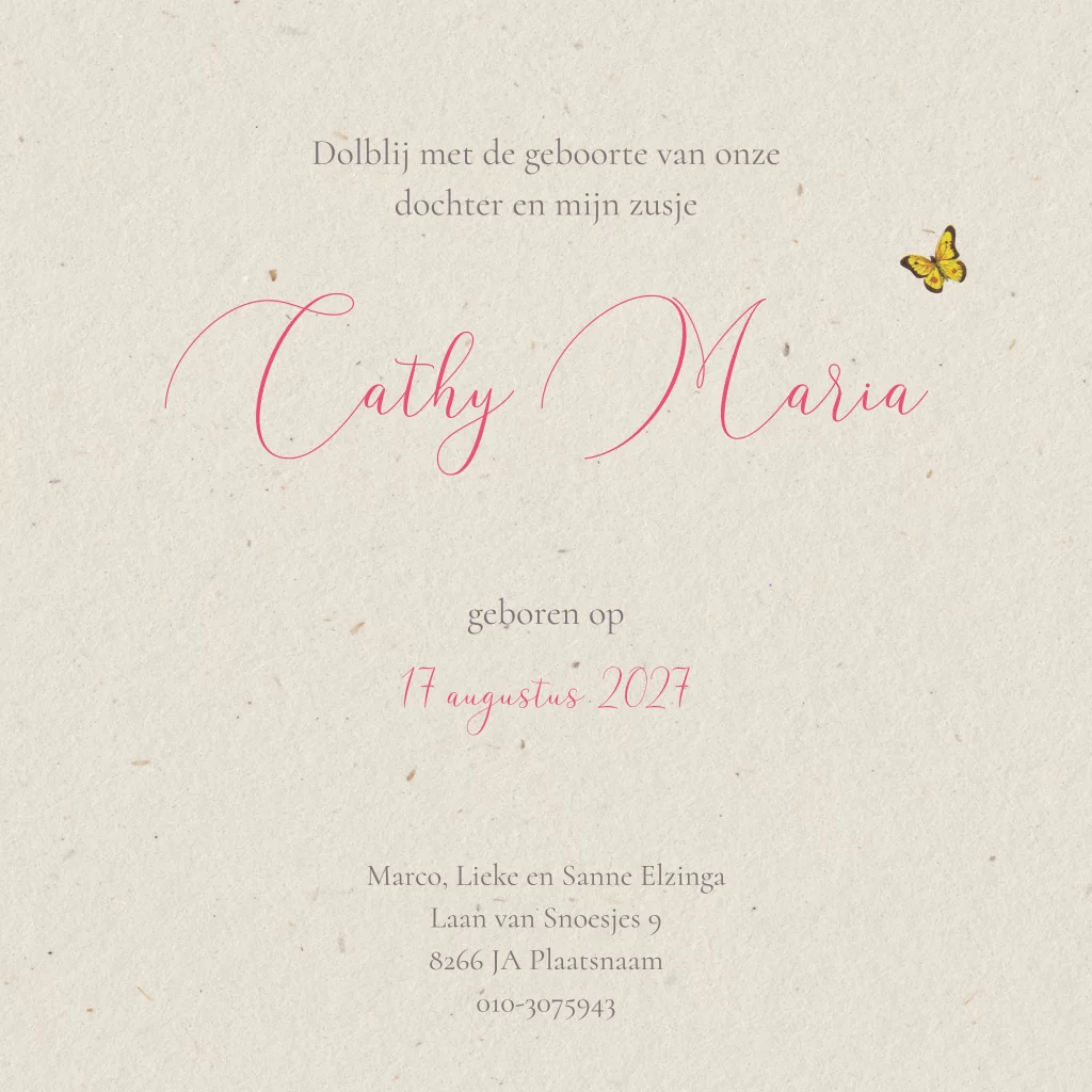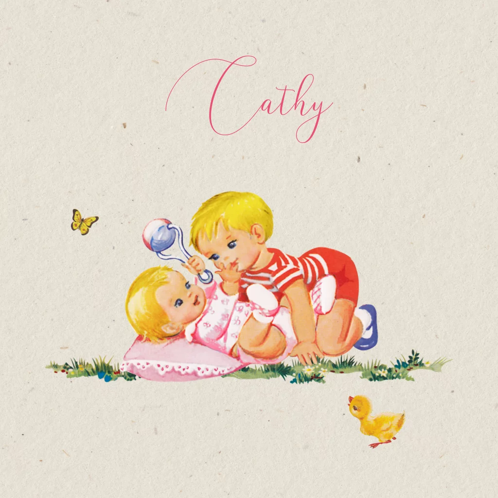 Lief geboortekaartje voor een 2e kindje met op de voorzijde de grote broer die met zijn kleine zusje speelt. In onze designtool kun je het kaartje zelf naar wens aanpassen. Heb je er hulp bij nodig, bel of mail ons dan gerust.
