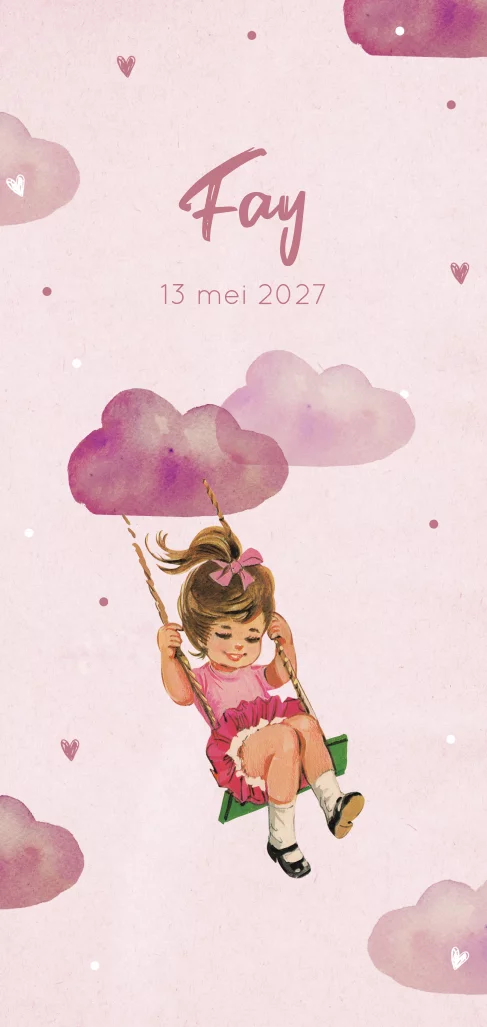 Langwerpige geboortekaart met roze achtergrond, versierd met stippen, hartjes en wolkjes. Aan de wolken hangt een schommel waarop een schattig meisje zit. Op de achterzijde kun je alle gegevens over je pasgeboren dochter kwijt.