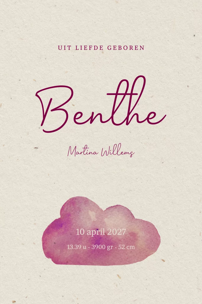 Het regent roze hartjes uit een grote roze wolk op dit lieve vintage geboortekaartje! Op de voorzijde staat de naam van je pasgeboren dochtertje met sierlijke letters in het wolkje van roze waterverf. Binnenin de kaart is ruimte voor een gedichtje en de geboortegegevens. Nog niet helemaal tevreden? Maak de kaart zelf verder af in de ontwerptool.