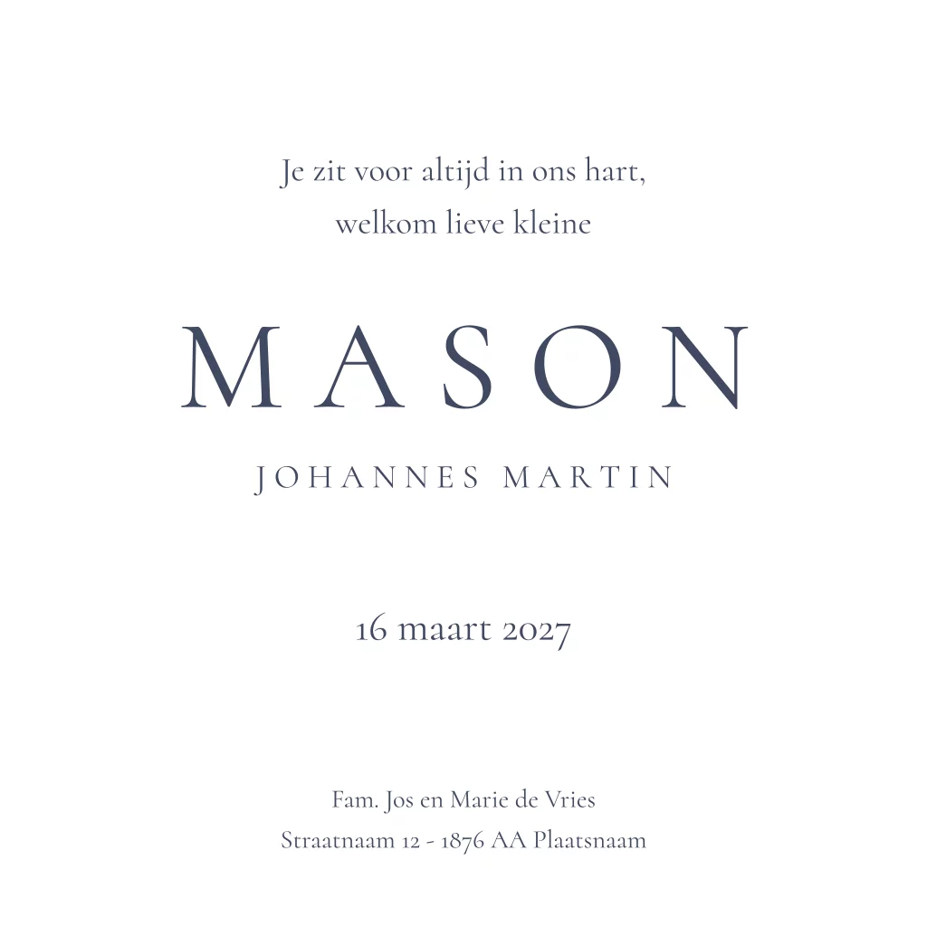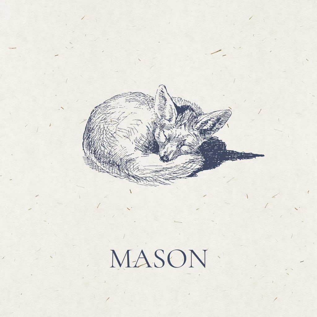 Supermooi geboortekaartje met een vintage illustratie van een slapend vosje, helemaal in elkaar gekruld. Less is more! Binnenin komt het vosje nog een keer klein terug. De hele kaart is in één kleur donkerblauw. Deze kleur kunt u zelf wijzigen in een gewenste kleur. Ook kunt u alle teksten zelf aanpassen in onze ontwerptool.