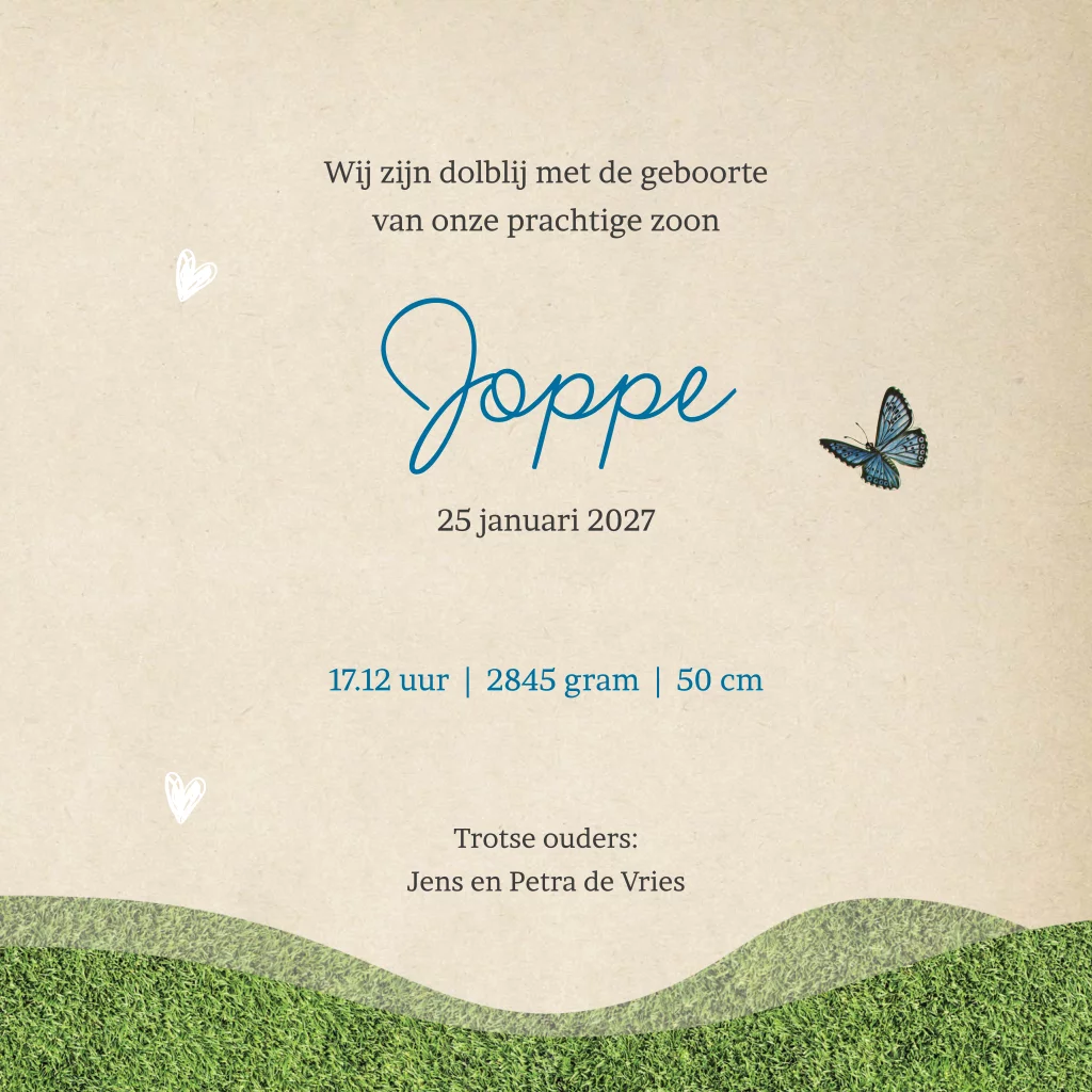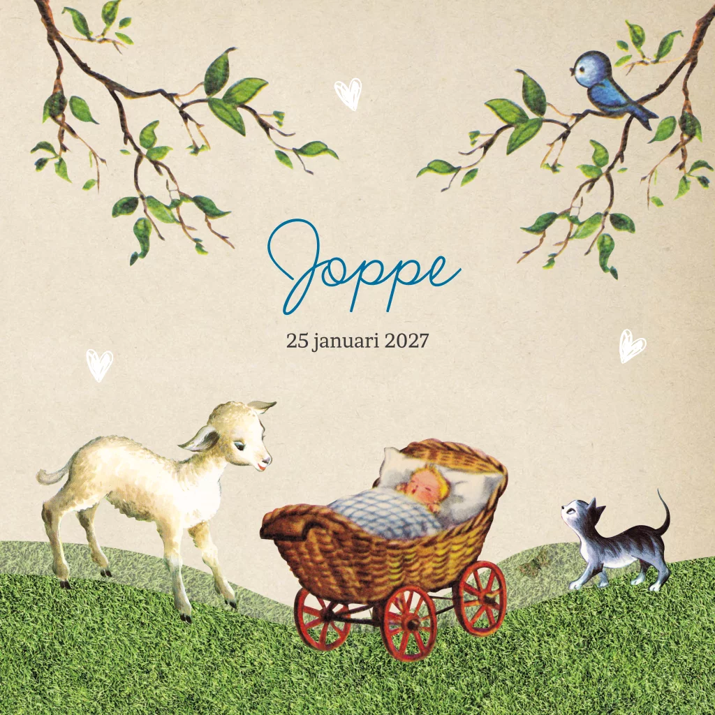 Liefhebbers van natuur en vintage kaartjes opgelet. Dit nieuwe geboortekaartje is speciaal voor jullie ontworpen. De kaart heeft een achtergrond van ouderwets kraftpapier. Op het gras dartelt een lammetje en kijkt een kat voorzichtig in de kinderwagen. Het drietal wordt omringd door takken en bladeren. Je kunt de kaart helemaal naar wens inrichten en eventueel illustraties toevoegen in onze handige ontwerptool.