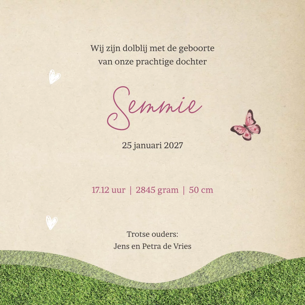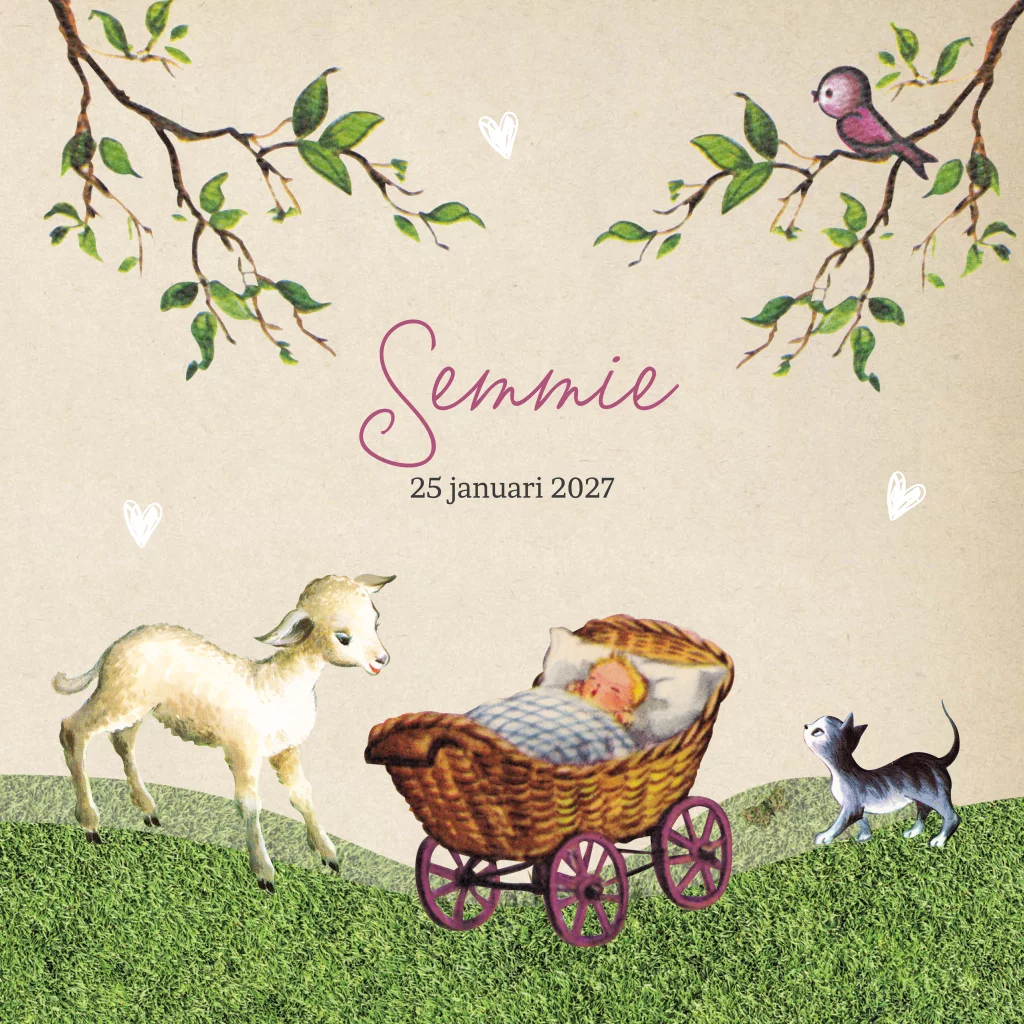 Zijn jullie echte liefhebbers van vintage geboortekaartjes? Dan is dit geboortekaartje speciaal voor jullie gemaakt. De kaart heeft een achtergrond van retro kraftpapier, versierd met takken en hartjes. Op het grasveld staat een kinderwagen met roze wielen. Een lammetje en katje kijken verwonderd naar het pasgeboren meisje. Pas de kaart naar wens aan met de designtool.