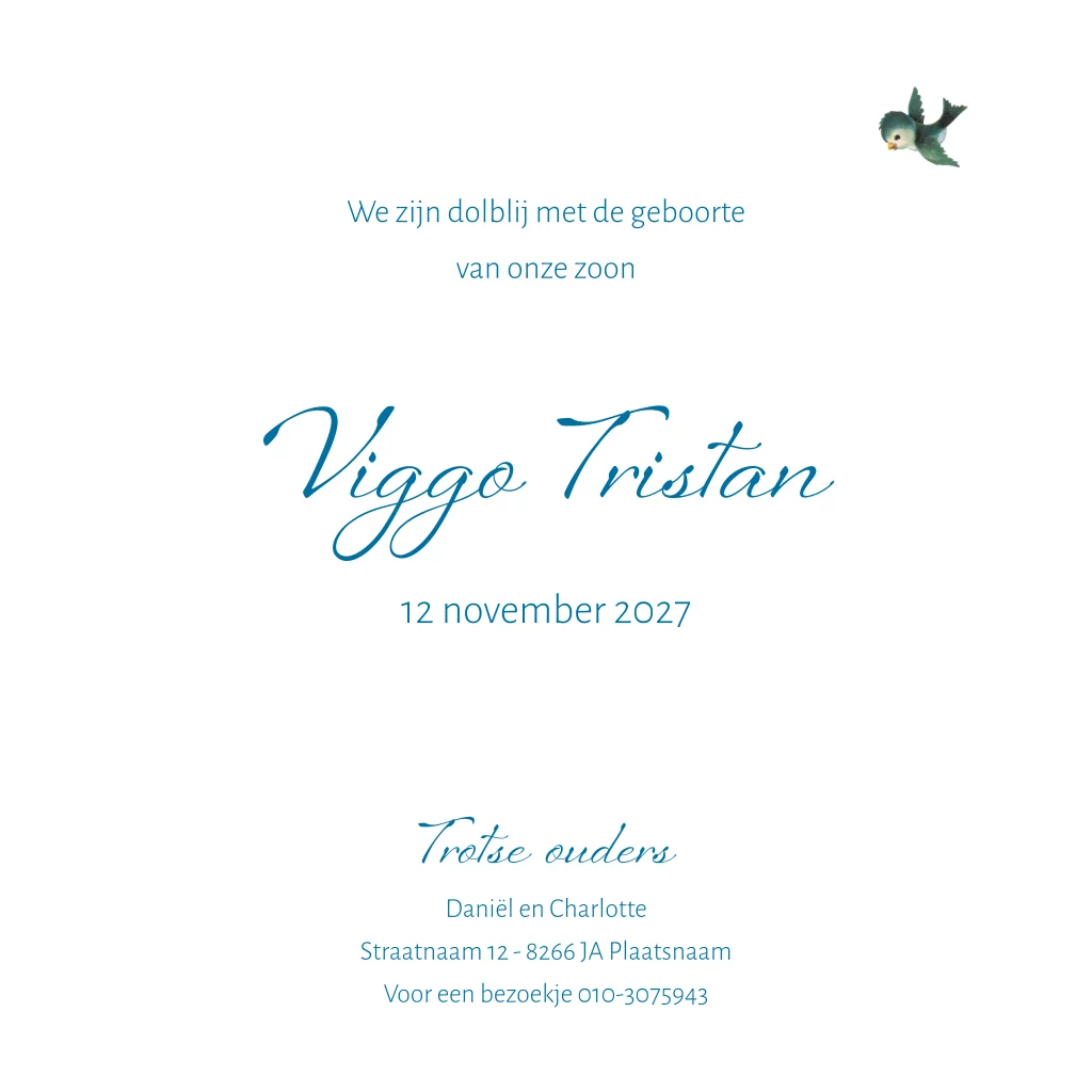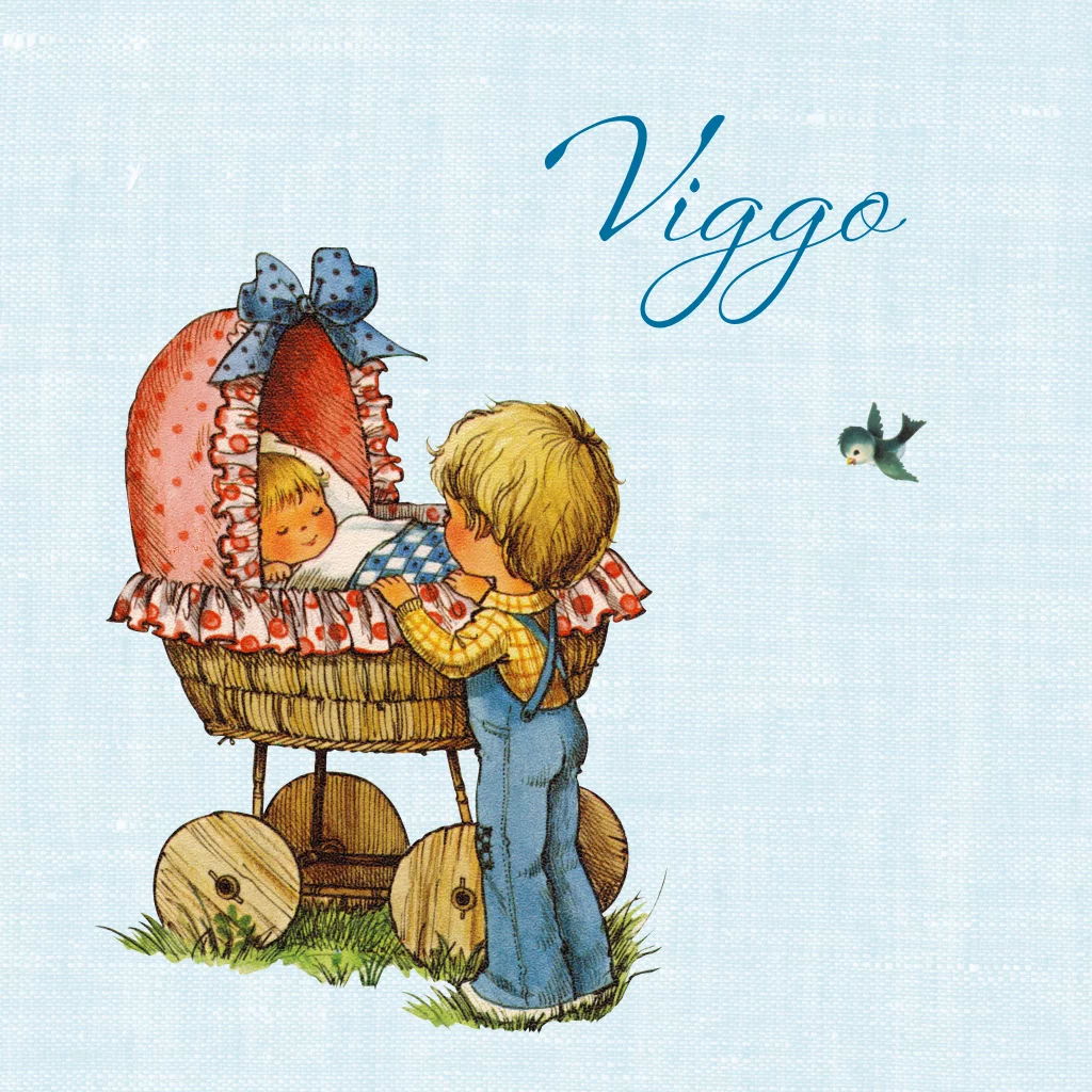 Retro geboortekaartje voor de komst van een 2e kindje met grote broer die in het wiegje van zijn pasgeboren broertje kijkt. Je kunt het kaartje zelf eenvoudig aanpassen met onze designool.
