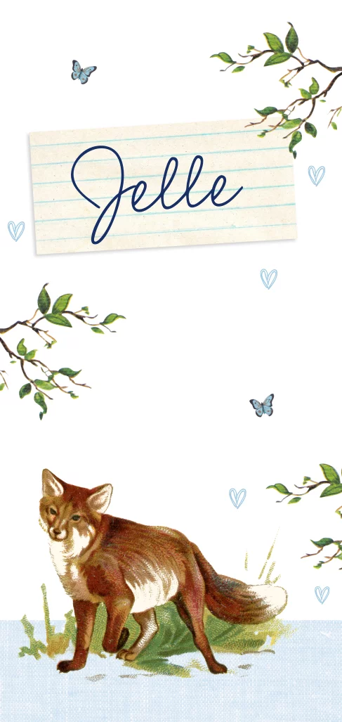 Ben je op zoek naar een mooi geboortekaartje met een vintage uitstraling voor je pasgeboren zoontje? Ga dan voor dit enkele kaartje met een ouderwetse tekening van een vosje erop. De hartjes, takjes en vlinders maken dit kaartje helemaal af! Liever een stoer lettertype? Pas dit ontwerp eenvoudig aan in onze ontwerptool.