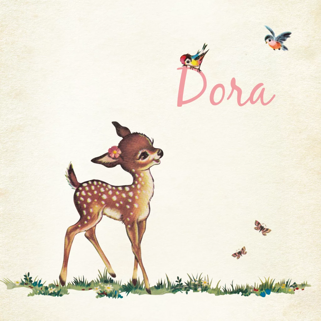 Retro geboortekaartje meisje met lief hertje en vogeltjes