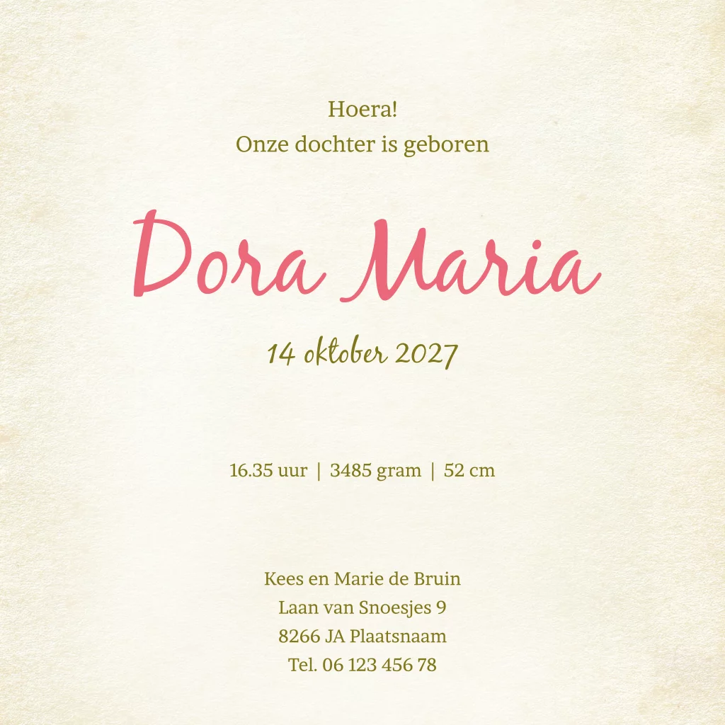 Vintage geboortekaartje met lief hertje en vogeltje op de eerste letter van haar naam. De achtergrond is van 'oud' papier. Over de hele kaart vliegen vlindertjes rond. Pas de kaart nog zelf aan in de designtool.