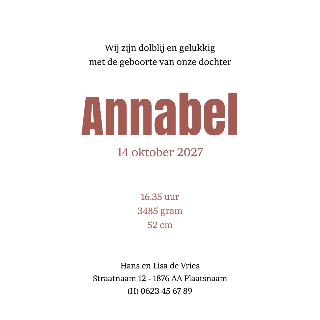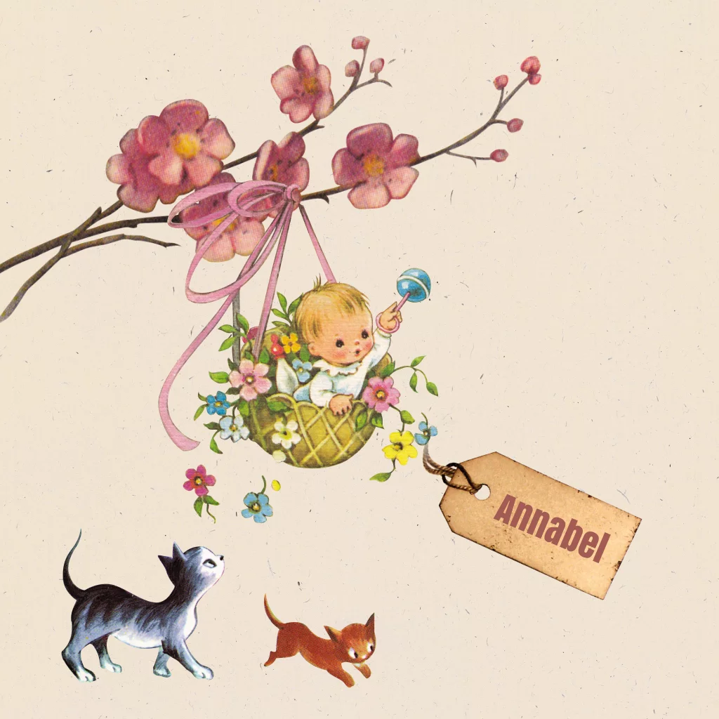 Retro geboortekaartje met lieve plaatjes uit de oude doos. Het baby meisje hangt in een mandje aan een tak met bloemetjes. Twee poezen komen een kijkje nemen. De naam staat op het labeltje dat aan het mandje hangt. Pas zelf de teksten aan en verplaats eventueel de plaatjes.
