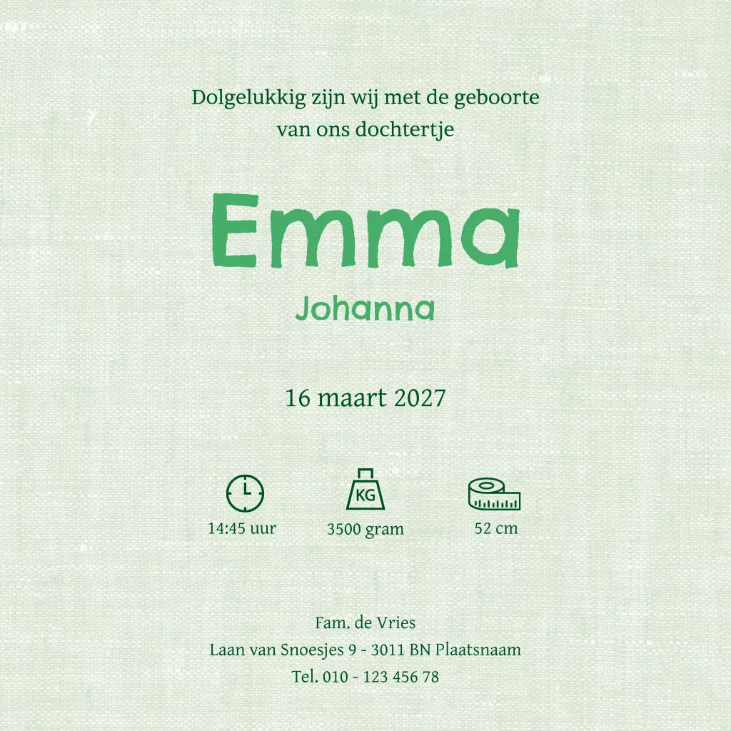 Lief geboortekaartjes met plaatjes uit de 'oude doos'. Lief meisje dat ligt te slapen in een houten wiegje met kwetterende vogel op de rand. Twee hondjes komen nieuwsgierig aanrennen.