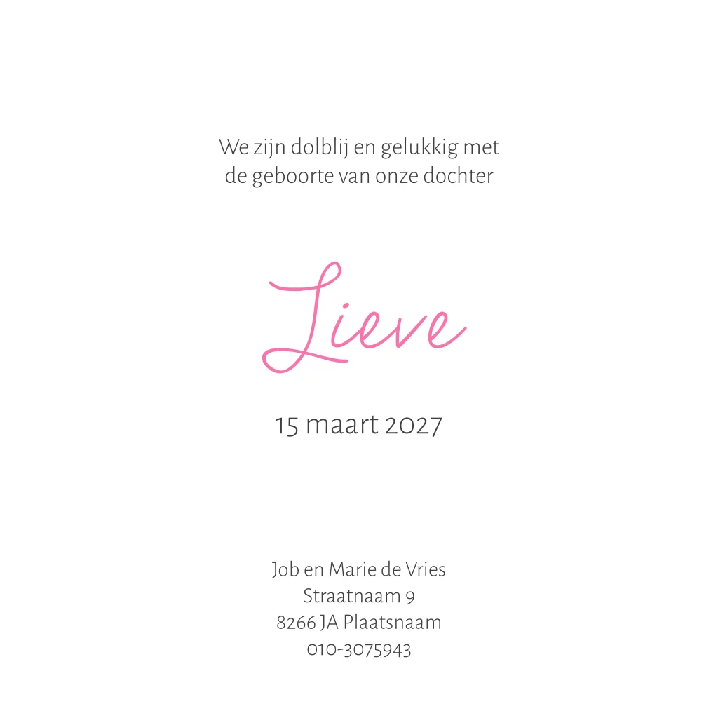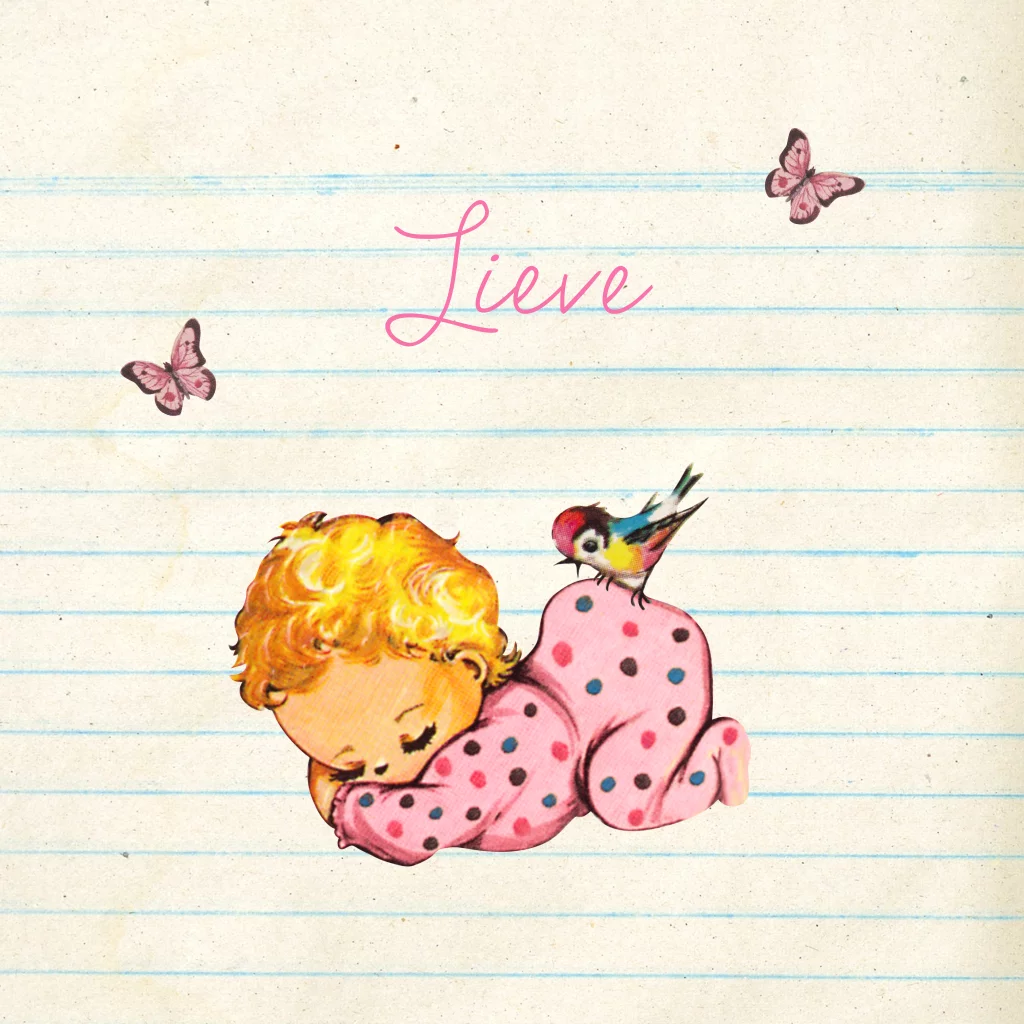 Schattig geboortekaartje in retrostijl. Met een lief slapend meisje op de voorzijde en een nieuwsgierig vogeltje op haar rug. Roze vlindertjes vliegen in het rond. De achtergrond is een plaatje van een oud schoolschriftje. Pas zelf de kaart naar wens aan.