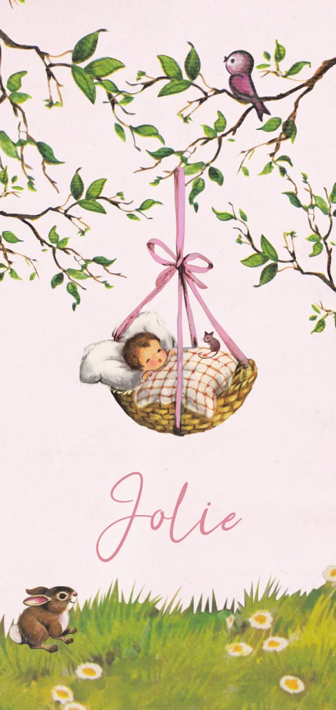 Mooie roze geboortekaart met een wiegje aan een tak van een boom. In het wiegje ligt een klein meisje te slapen. Op de tak fluit een roze vogel een vrolijk lied. Op de achterzijde kun je alle informatie over je pasgeboren kindje kwijt.