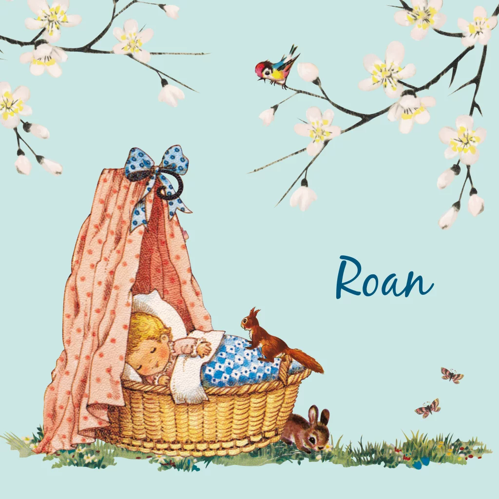 Snoezig retro geboortekaartje voor de geboorte van een jongen aan te kondigen met baby jongetje in een rieten mandje, omgeven door bloesem en lieve diertjes (konijn, eekhoorn, vogel, vlinders). Heb je hulp nodig bij de opmaak, vraag ons dan gerust, wij helpen je graag!