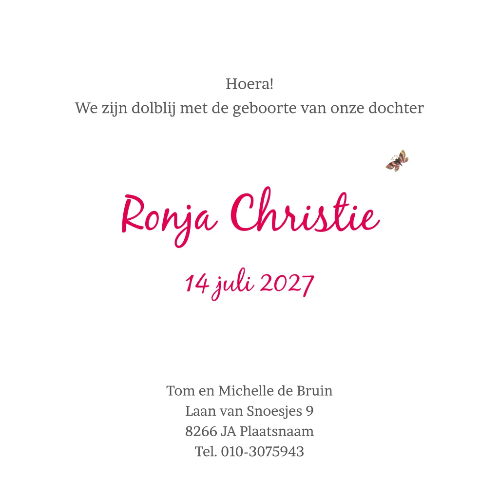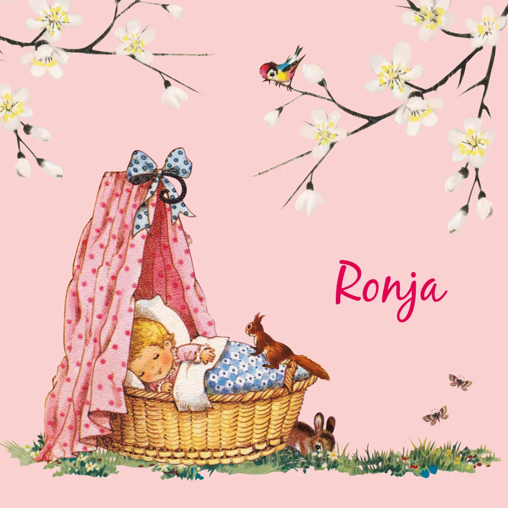 Snoezig retro geboortekaartje om de geboorte van jullie dochter aan te kondigen. Een lief baby meisje ligt te slapen in een rieten mandje, omgeven door bloesem en lieve diertjes (konijn, eekhoorn, vogel, vlinders). Pas het geboortekaartje eenvoudig aan met de editor.