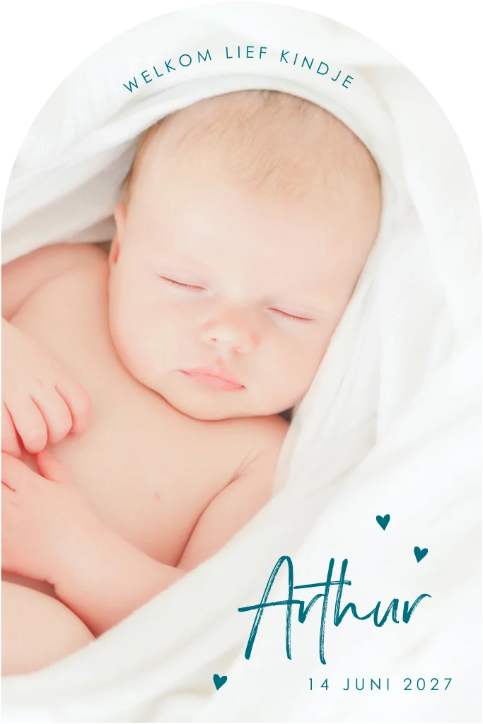 Een origineel geboortekaartje met grote foto en hartjes. Stel je zoontje aan de wereld voor met dit unieke kaartje in bijzondere vorm. Liever een ander lettertype? Gebruik onze ontwerptool om dit kaartje naar wens op te maken. Zo kun je ook de kleuren veranderen en een eigen foto toevoegen. Bestel een proefdruk om de kaart in het echt te kunnen zien.