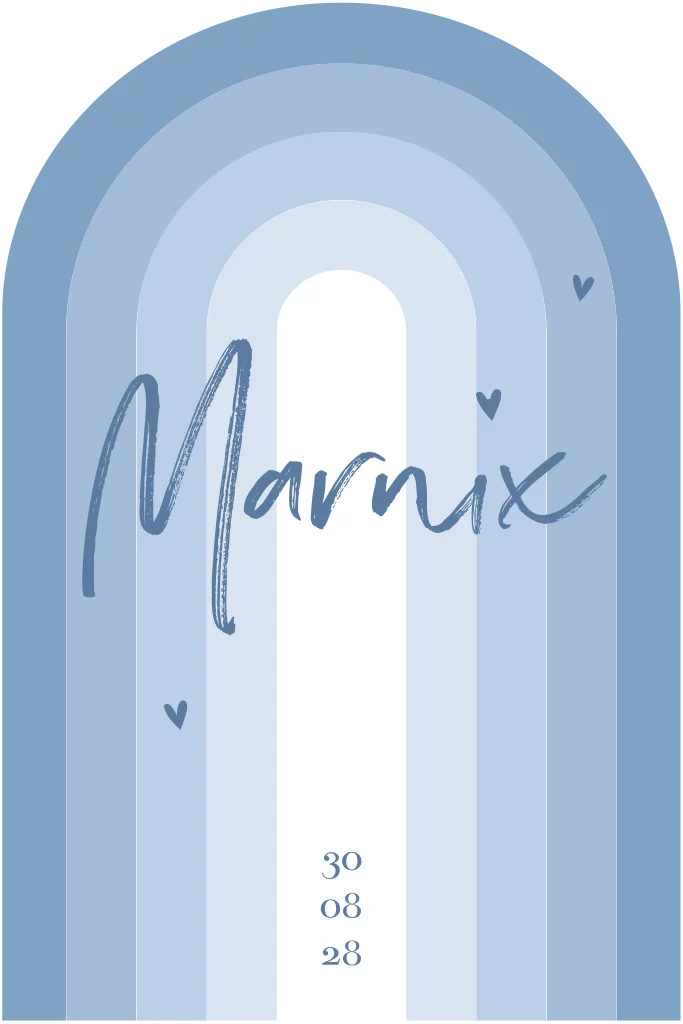 Geboortekaartje in de vorm van een regenboog ofwel arch met regenboog in blauwe tinten van licht naar donker. Je kunt de kleuren van de regenboog aanpassen met de editor, elke kleur kun je los aanklikken. Maak de kaart naar wens op en bestel een drukproef.