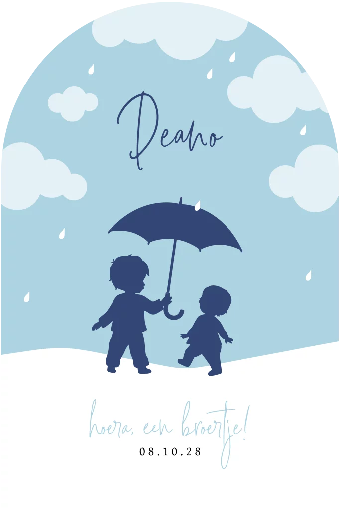 Wordt jouw tweede kindje in een regenachtige maand geboren? Kondig zijn komst aan met dit leuke halfronde kaartje met silhouet kindjes in de regen! Grote broer houdt een paraplu vast om zijn lieve kleine broer te beschermen tegen de regen. Op de achterkant stampt hij vrolijk in een regenplas. Pas dit blauwe ontwerp zelf aan in onze editor en bestel een proefdruk.