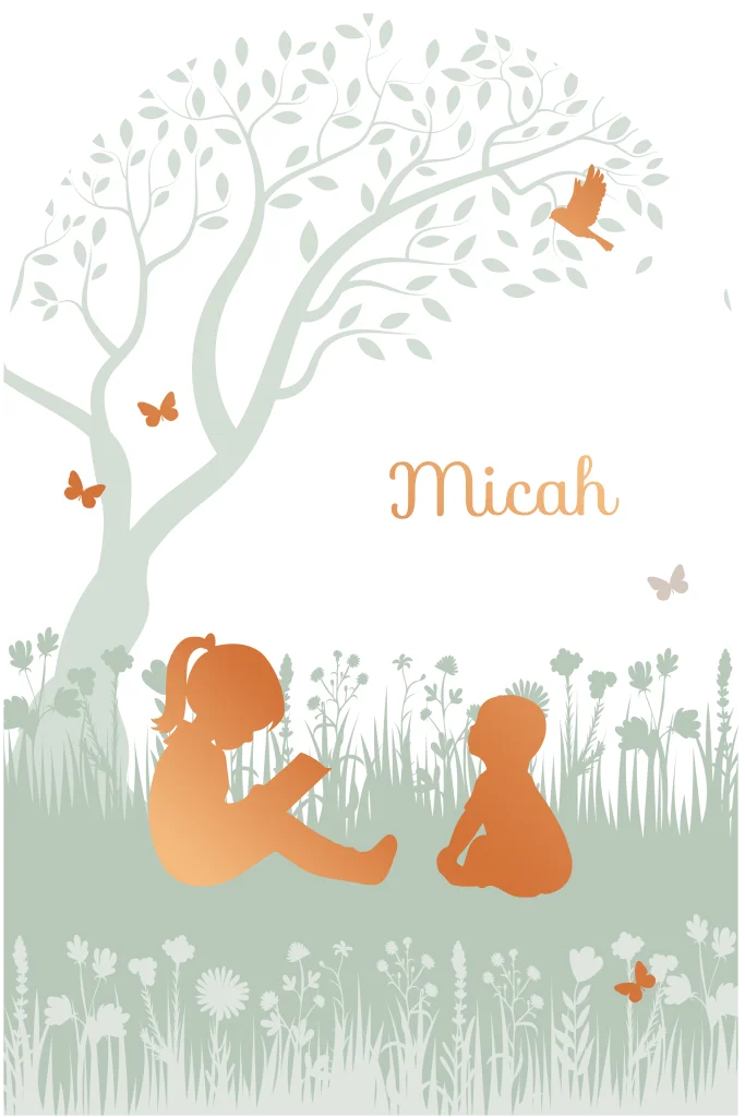 Kondig de komst van je tweede kindje aan met dit betoverende geboortekaartje in halfronde vorm. De naam van je zoontje komt boven een silhouet zus voorlezend aan haar lieve baby broertje, onder de beschutting van een majestueuze boom. Met bloemen in bloei, dansende vlindertjes en de belofte van ontluikend leven, straalt deze kaart warmte en verwondering uit voor dit nieuwe hoofdstuk in jullie leven. De naam, silhouetjes, vlindertjes en een vogeltje worden in glimmend koperfolie gedrukt, voor een extra bijzonder en feestelijk effect. Pas dit kaartje naar wens aan in onze editor.