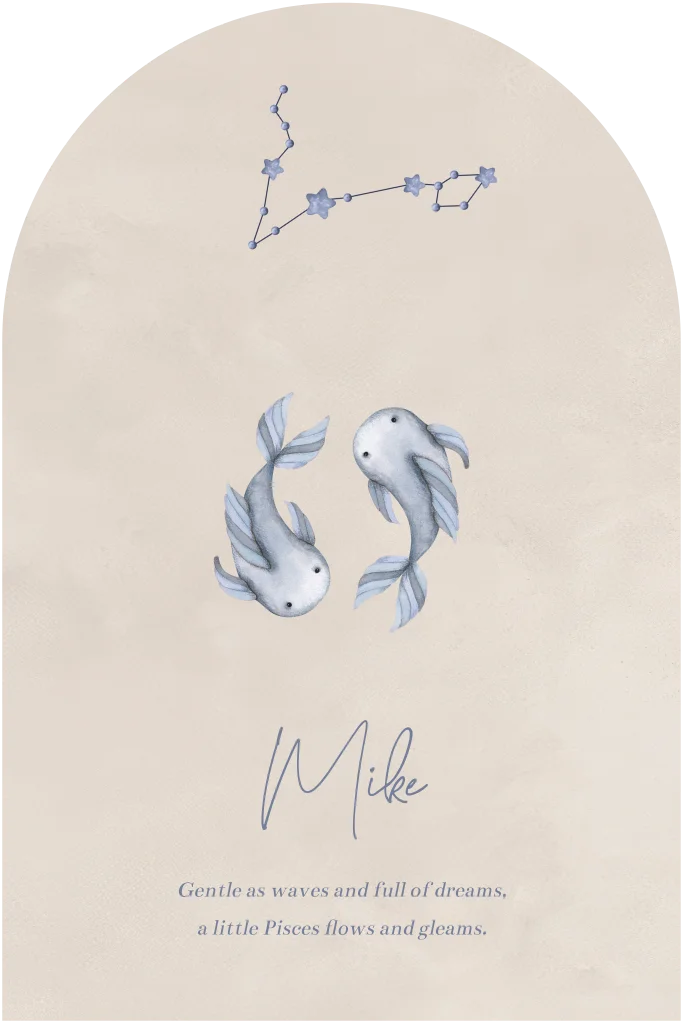 Lief geboortekaartje met twee vissen, perfect voor een dromerig en gevoelig kindje. Dit kaartje straalt zachtheid en fantasie uit, en is ideaal voor ouders die hun kleintje op een liefdevolle manier willen verwelkomen. Geschikt voor baby’s geboren tussen 19 februari en 20 maart.