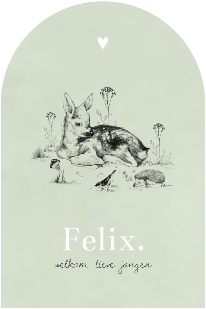 Een zachtgroen, lieflijk geboortekaartje met mooie potloodtekening van een baby hertje, omringd met bloemetjes, vogeltje en een egeltje. Op de achterzijde komt het egeltje terug. Dit kaartje heeft een halfronde vorm, dat maakt dit geboortekaartje voor je pasgeboren zoontje extra bijzonder! Pas deze kaart zelf aan in onze editor.