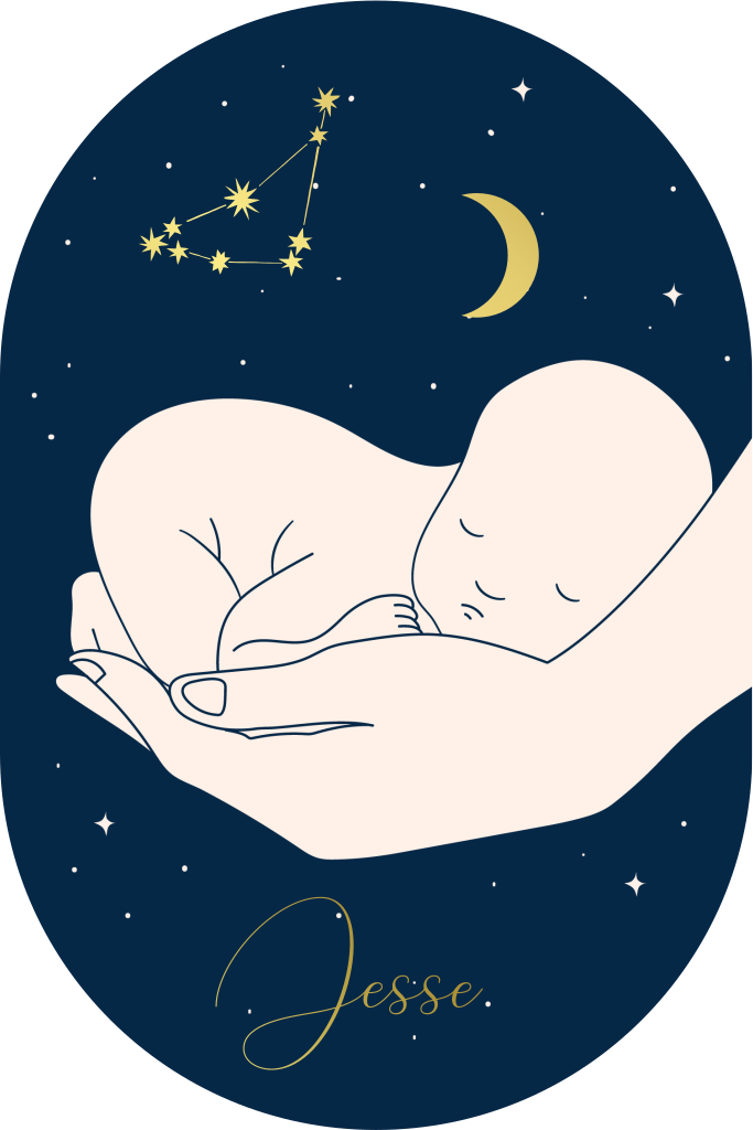 Mooi geboortekaartje voor een pasgeboren jongetje met een stijlvolle illustratie van een baby'tje dat in een hand ligt te slapen. De ovale vorm maakt het kaartje extra speciaal, zeker in combinatie met de goudfolie. Het juiste sterrenbeeld kun je terugvinden bij de map afbeeldingen bij sterrenbeelden. Pas het ontwerp naar wens aan.