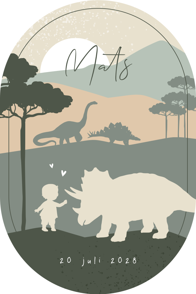 Kondig de komst van je zoontje aan met dit originele ovale geboortekaartje met dinosaurus silouetjes in een groen landschapje. Een silhouet jongetje staat voorop samen met een kleine triceratops. De verschillende groentinten van dit kaartje zorgen voor een stijlvol geheel. Pas deze kaart eventueel aan in onze ontwerptool en bestel een proefdruk.