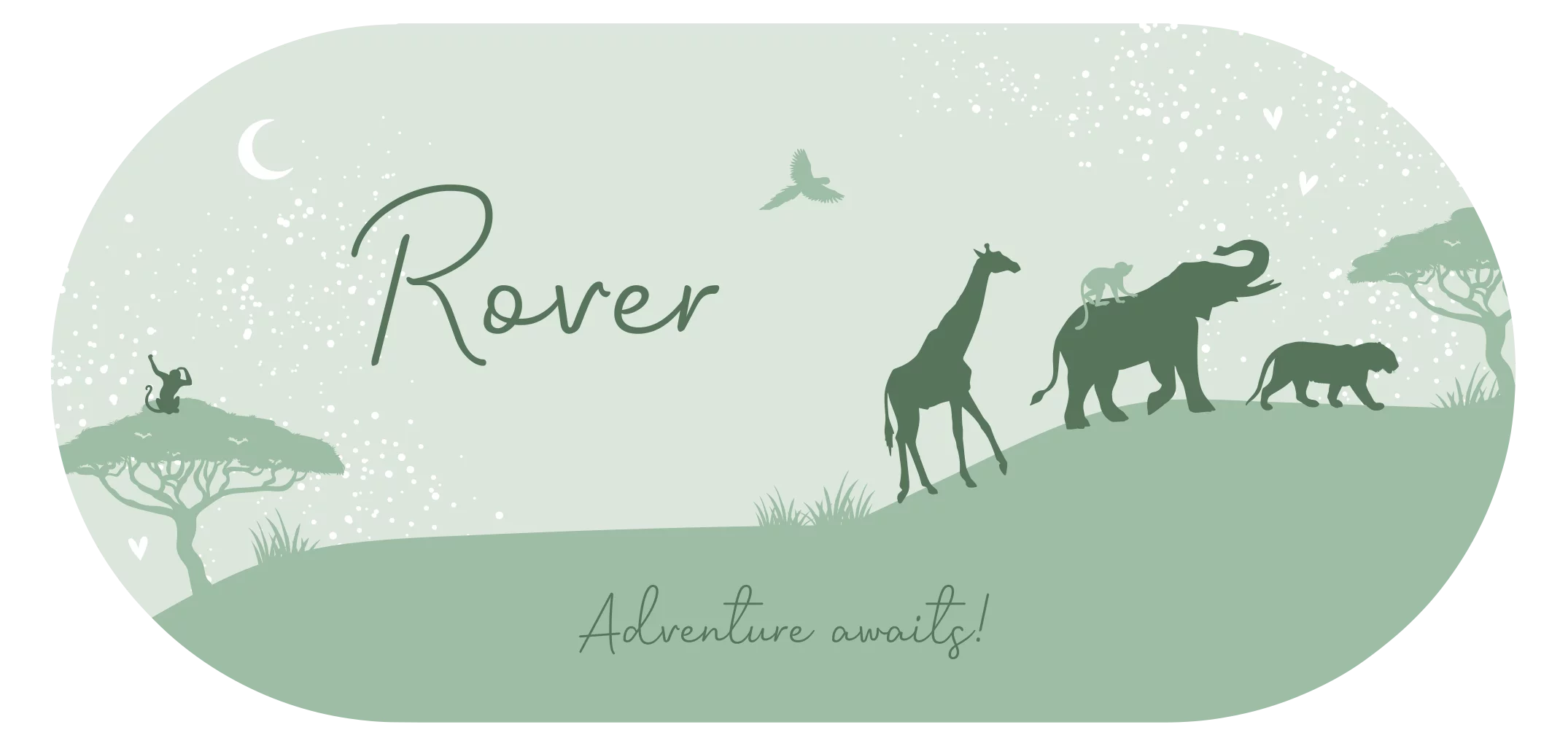 Een bijzonder geboortekaartje in langwerpig ovale vorm. Op dit groene kaartje staat een landschapje met allerlei wilde dieren. De naam van je pasgeboren zoontje komt in sierlijke letters tussen de bomen en dieren. Pas dit unieke kaartje zelf aan in onze ontwerptool.