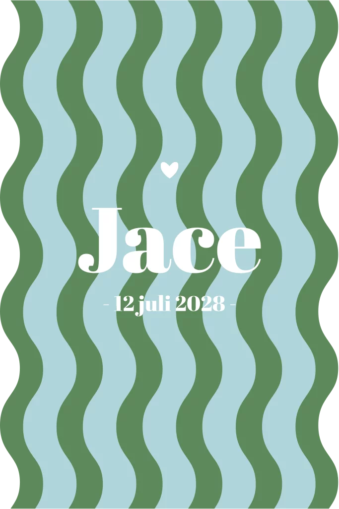 Retro geboortekaartje in aparte vorm met golvend patroon in blauw en groentinten. De naam van je zoontje staat in een stoer wit lettertype voorop de kaart. Retro ontwerpen zijn weer helemaal hip dit jaar. Pas de kaart aan en bestel een drukproef.