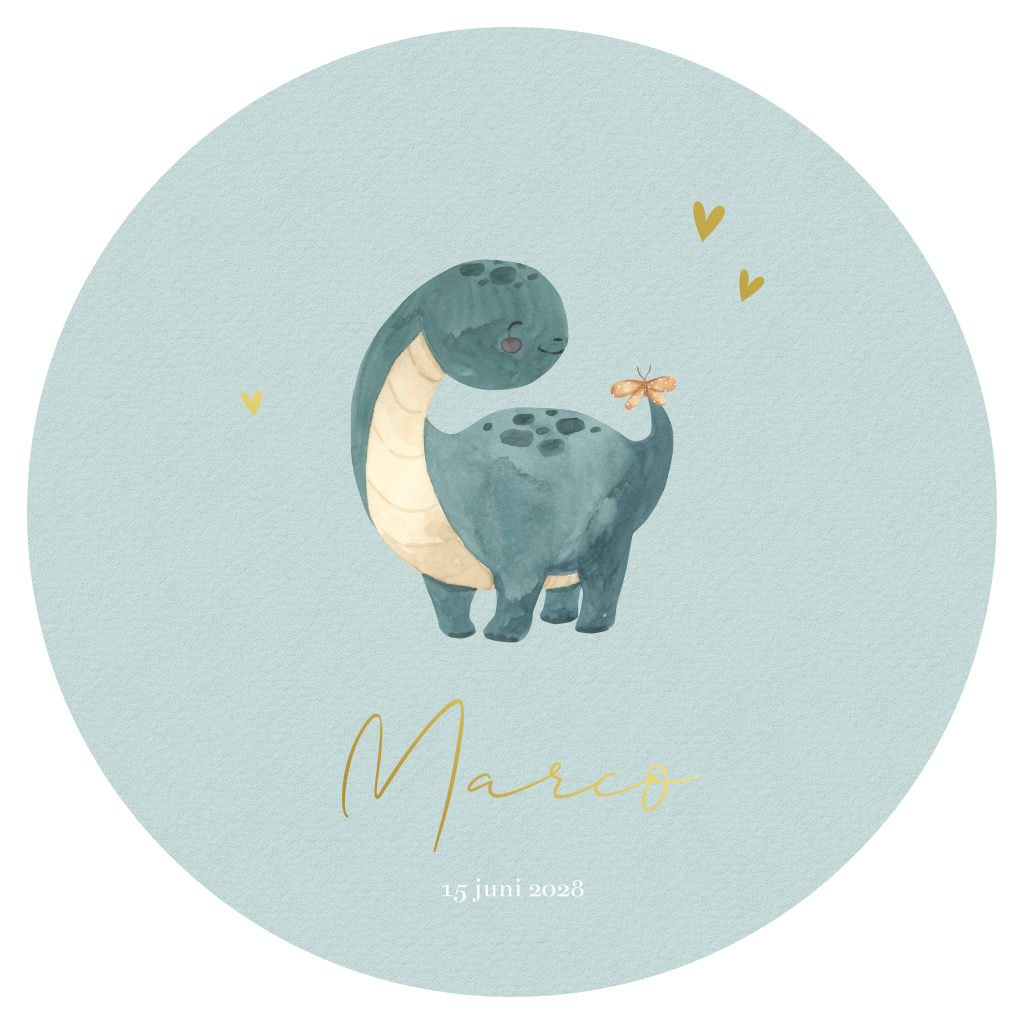 Lief geboortekaartje met dinosaurus op een blauwe ondergrond. De naam en de hartjes staan in goudfolie gedrukt. Kondig de komst van je zoon aan met dit ronde geboortekaartje. Pas het ontwerp zelf heel simpel aan in onze editor en bestel een proefdruk.