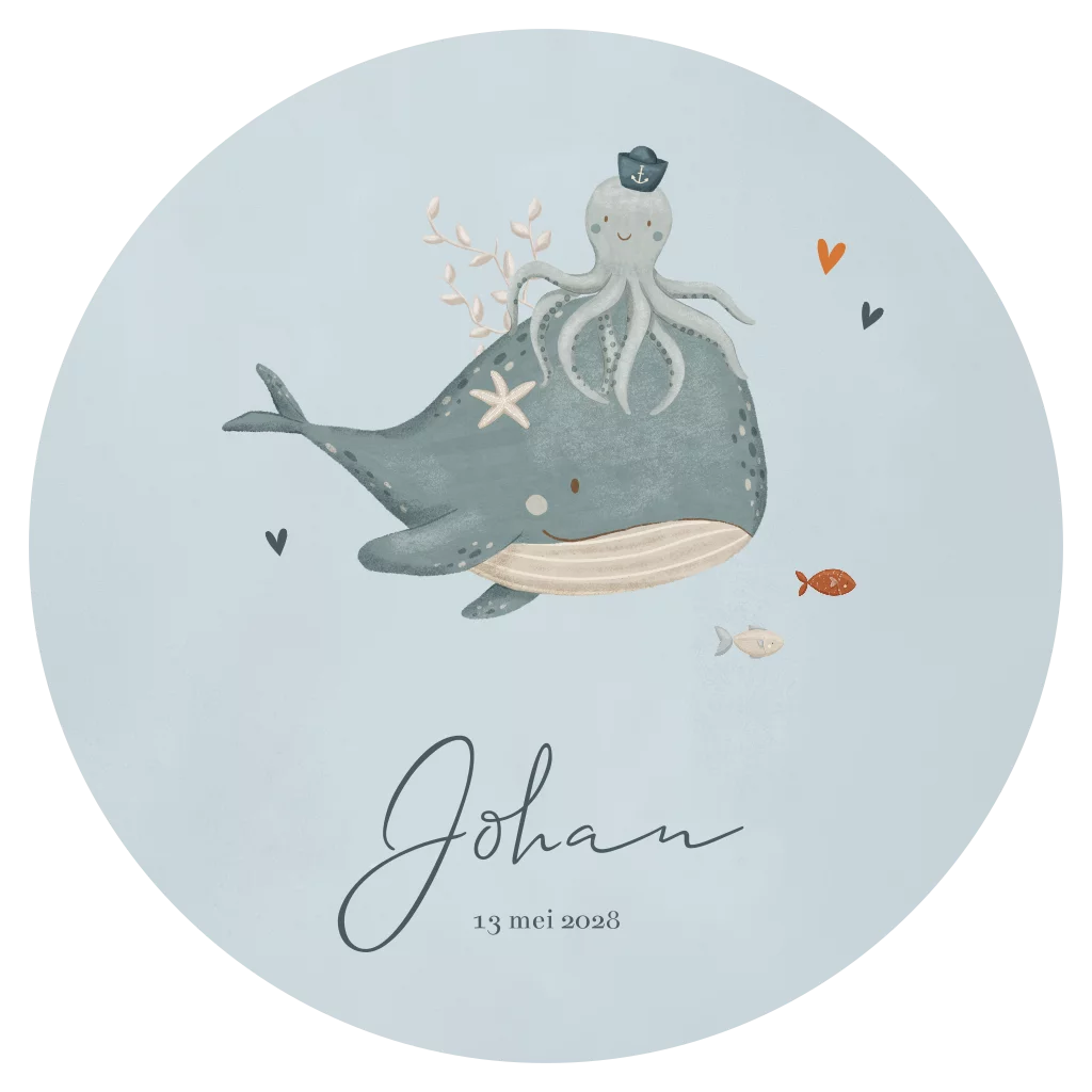 Geboortekaartje met walvis, octopus en visjes. De naam en de hartjes staan in blauw gedrukt. Kondig de geboorte van je zoon aan met dit ronde geboortekaartje met maritiem thema. Pas het ontwerp zelf heel simpel aan in onze editor en bestel een proefdruk.