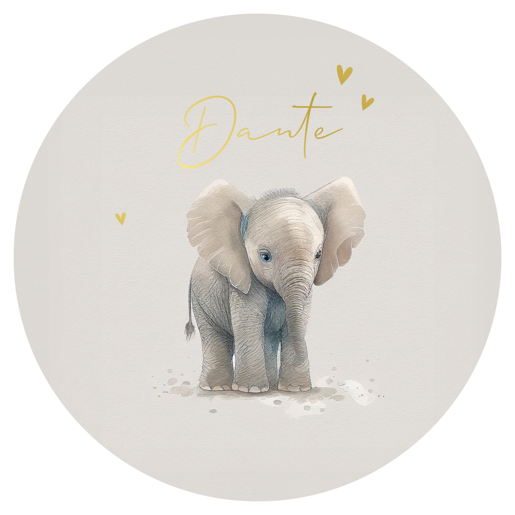 Lief geboortekaartje met olifant op een grijze ondergrond. De naam en de hartjes staan in goudfolie gedrukt. Kondig de komst van je zoon aan met dit ronde geboortekaartje. Pas het ontwerp zelf heel simpel aan in onze editor en bestel een proefdruk.