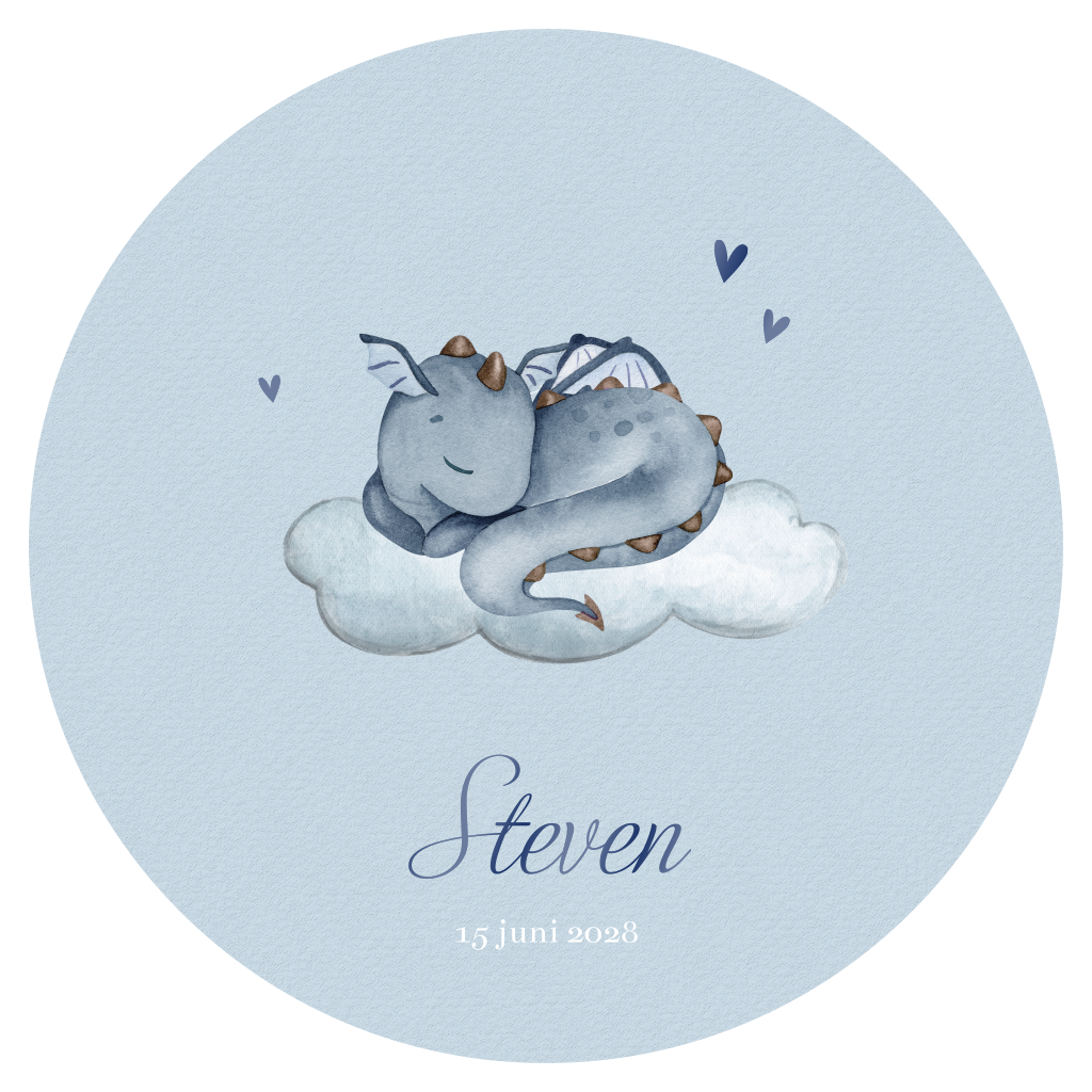 Rond lichtblauw geboortekaartje met slapend blauw draakje