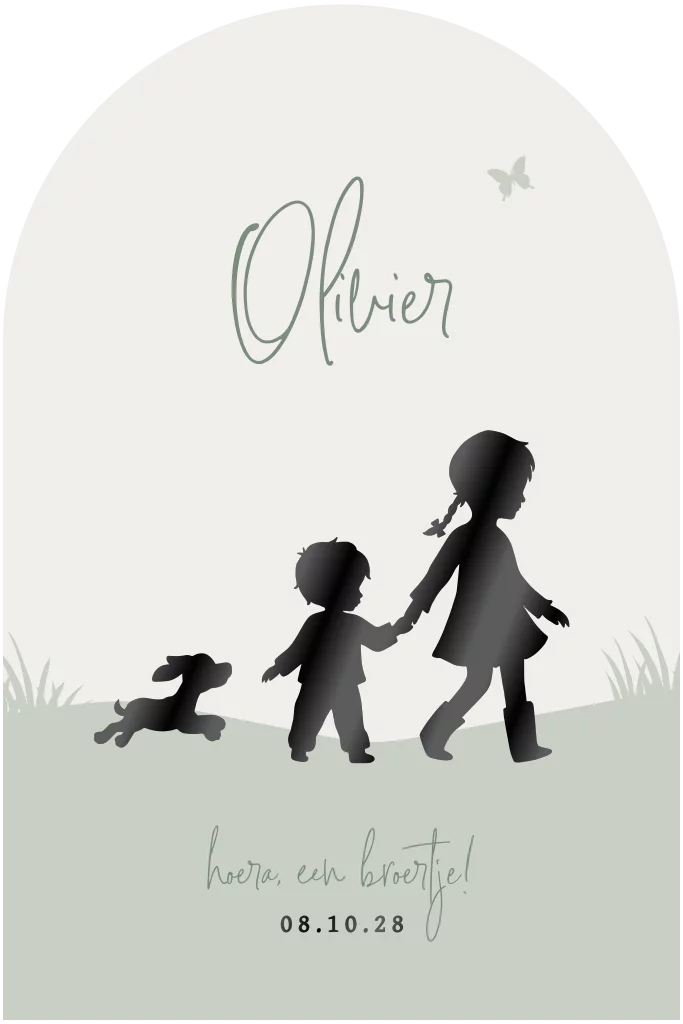 Op zoek naar een geboortekaartje voor een tweede kindje? Ga voor dit trendy ontwerp met hoogglans zwarte silhouetjes! Dit geboortekaartje heeft een bijzondere vorm én wordt bedrukt met hoogglans. Grote zus en kleine broer wandelen hand in hand en een klein hondje rent vrolijk achter ze aan. Liever andere kleuren of lettertypes? Pas dit kaartje naar eigen wens aan in onze editor.