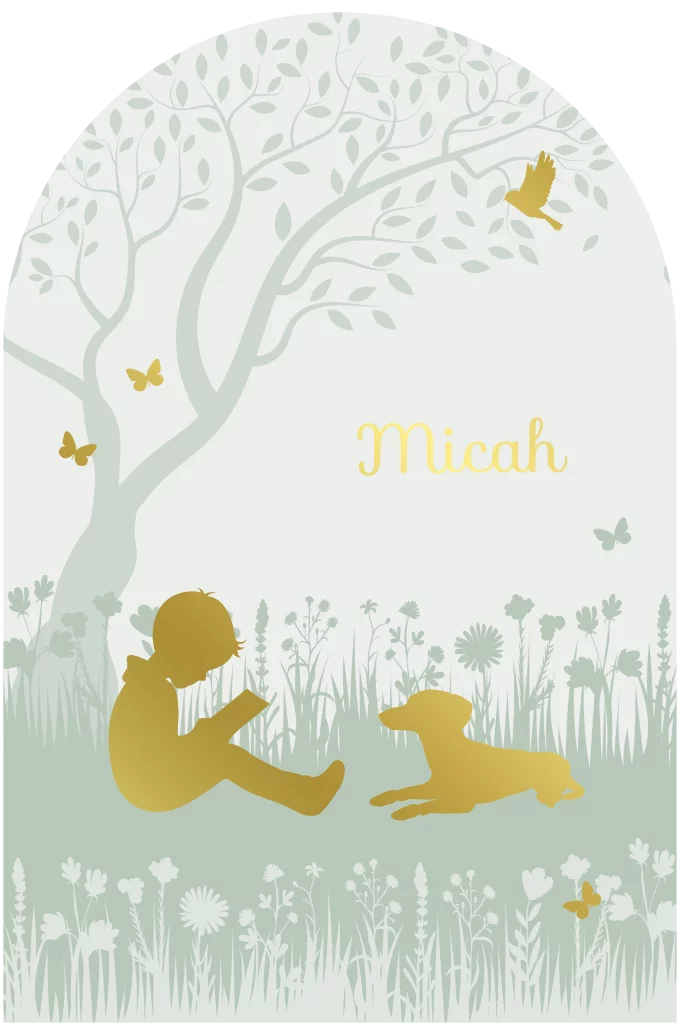 Kondig de komst van je prachtige zoon aan met dit betoverende geboortekaartje in halfronde vorm. De naam van je zoontje komt boven een silhouet jongetje, lezend onder de beschutting van een majestueuze boom, vergezeld door een lief hondje. Met bloemen in bloei, dansende vlindertjes en de belofte van ontluikend leven, straalt deze kaart warmte en verwondering uit voor dit nieuwe hoofdstuk in je leven. De naam, silhouetjes, vlindertjes en een vogeltje worden in glimmend goudfolie gedrukt, voor een extra bijzonder en feestelijk effect. Pas dit kaartje naar wens aan in onze editor.