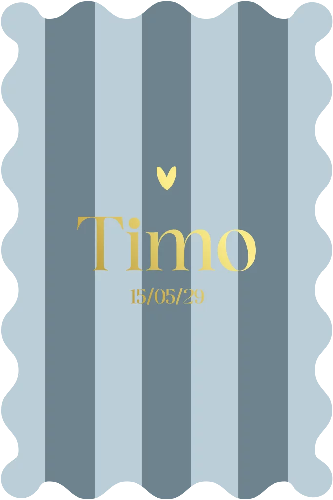 Deze stijlvolle jongenskaart heeft een klassieke uitstraling met brede verticale strepen in zachte blauwtinten. De golvende stansvorm van de kaart geeft het ontwerp een hip uiterlijk.