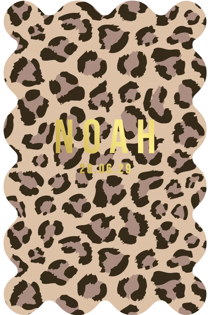Superhip geboortekaartje met een speelse panterprint die een stoere jungle vibe geeft. De stans met golvende rand maakt de kaart extra uniek. De naam van je zoontje wordt gedrukt in glanzende goudfolie, welke echt van de kaart spat. Een perfecte keuze voor een avontuurlijke en stijlvolle aankondiging. Personaliseer het ontwerp helemaal naar jouw smaak en bestel eenvoudig een drukproef om het resultaat te zien.
