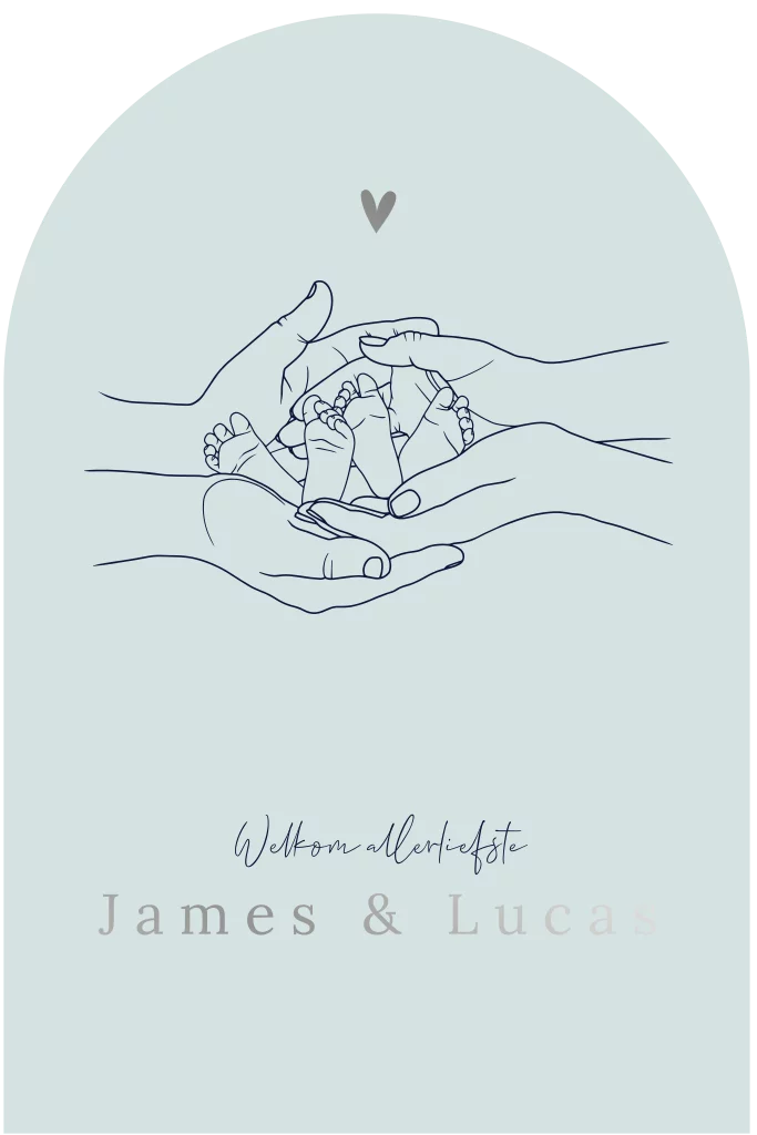 Kondig de komst aan van je tweeling jongens met dit bijzondere geboortekaartje in boogvorm en afgewerkt met zilverfolie. De namen van je twee zoontjes komen in glimmend zilverfolie voorop. Daarboven staat een mooie lijntekening van twee paar handen en twee paar kleine voetjes. Personaliseer dit ontwerp naar jouw smaak in onze editor en bestel een proefdruk.