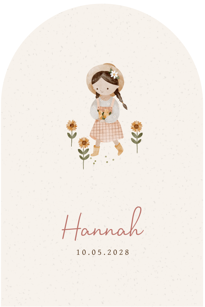 Lief geboortekaartje met een boerinnetje met zonnebloemen en kuikentjes. Op de achterkant komt de illustratie van het meisje terug. Een mooi geboortekaartje in bijzondere vorm. Pas het ontwerp zelf aan in onze editor en bestel een proefdrukje.