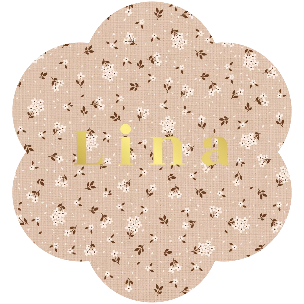 Trendy geboortekaartje met goudfolie naam en in de vorm van een bloem. Op de achtergrond staat een patroon van kleine bloemetjes in creme en donkerbruin. De unieke vorm van dit kaartje maakt dit helemaal tot een bijzonder design. Liever hoogglans of een ander lettertype? Pas dit kaartje zelf aan in onze editor.