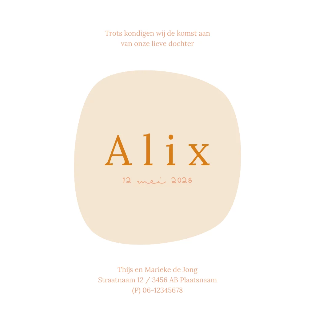 Een eigentijds geboortekaartje in trendy kleuren, zoals lila, zalmroze en okergeel. De voorkant van dit kaartje heeft een doorkijkje, waardoor de naam van je dochtertje tevoorschijn komt. De geboortegegevens van je pasgeboren kleine staan in de ruitjes aan de binnenzijde. Een origineel en uniek geboortekaartje! Geef je eigen draai aan dit ontwerp met onze handige editor.