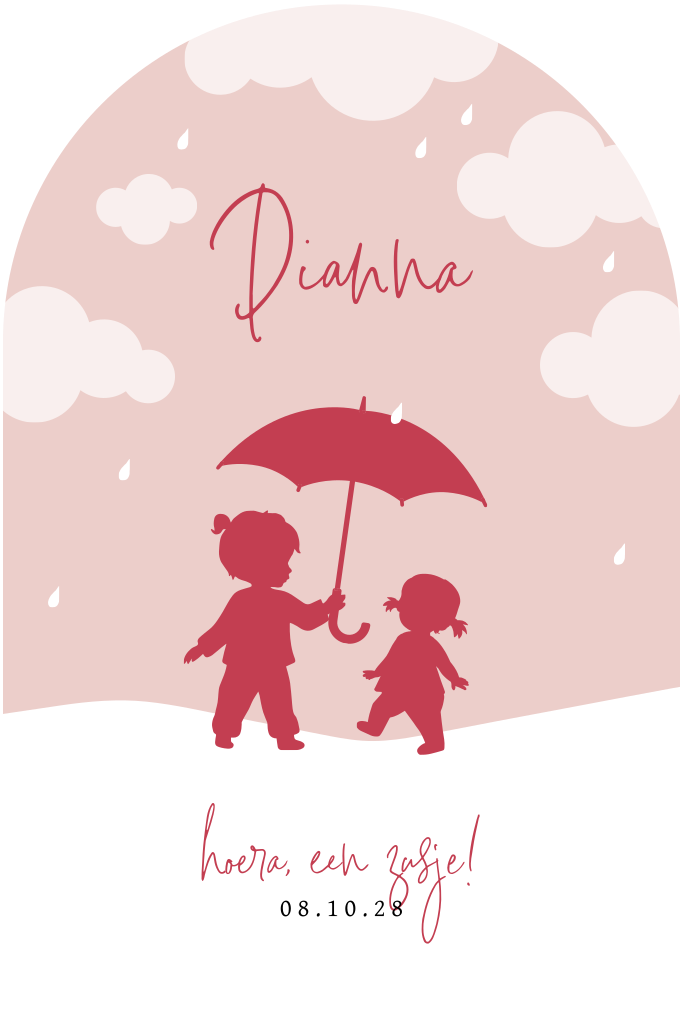 Wordt jouw tweede kindje in een regenachtige maand geboren? Kondig zijn komst aan met dit leuke halfronde kaartje met silhouet kindjes in de regen! Grote zus houdt een paraplu vast om haar lieve kleine zus te beschermen tegen de regen. Op de achterkant stampt ze vrolijk in een regenplas. Pas dit blauwe ontwerp zelf aan in onze editor en bestel een proefdruk.