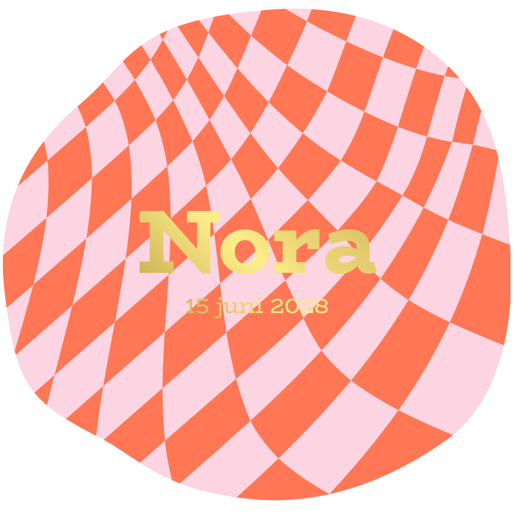 Groovy geboortekaartje voor een meisje in organisch ronde vorm. De psychedelisch ruitjes zijn in twee kleuren roze en oranje met de naam in een stoer, goudfolie lettertype. Ben je op zoek naar een opvallend geboortekaartje? Dan is dit ontwerp met retrolook helemaal hot.