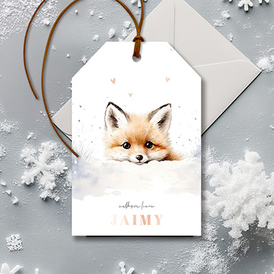 Dit prachtige geboortekaartje in labelvorm straalt een winterse sfeer uit. Het ontwerp toont een schattig vosje dat nieuwsgierig over een sneeuwrand heen kijkt, omringd door vallende sneeuwvlokjes. De kleine hartjes boven het vosje zijn gedrukt met folie, evenals de naam. Bovenaan bevindt zich een gaatje, perfect om een lint doorheen te halen en het kaartje als label te gebruiken. Dit geboortekaartje brengt een warme en sfeervolle wintervibe met zich mee.