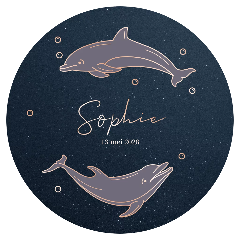 Vier de geboorte van je dochter met dit bijzondere, ronde geboortekaartje! Twee lieve dolfijntjes zwemmen in een cirkel rondom de naam van je dochtertje. De naam en bellen zijn gedrukt in roségoudfolie. Personaliseer het ontwerp eenvoudig in onze editor en bestel een proefdruk om het eindresultaat te bekijken.