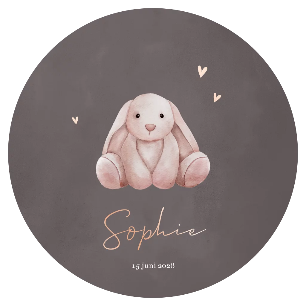 Lief geboortekaartje met roze konijntje op een donkerbruine ondergrond. De naam en de hartjes staan in rosegoudfolie gedrukt. Kondig de komst van je dochtertje aan met dit ronde geboortekaartje. Pas het ontwerp zelf eenvoudig aan in onze ontwerptool en bestel een proefdruk.