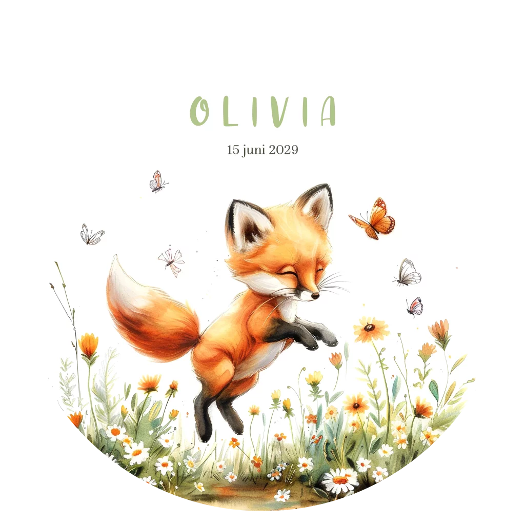 Wordt jouw dochtertje deze lente geboren? Dan is dit schattige geboortekaartje met een speels vosje, vrolijk dartelend tussen kleurrijke bloemen, een perfecte keuze! De unieke ronde vorm geeft de kaart een trendy uitstraling, terwijl het gaatje ruimte biedt voor een mooi lint waarmee je het kaartje nét dat beetje extra geeft. Personaliseer het ontwerp eenvoudig in onze gebruiksvriendelijke editor en bestel een proefdruk om het kaartje in het echt te bewonderen. Maak jouw babykaart met dit hippe, lente-frisse geboortekaartje!
