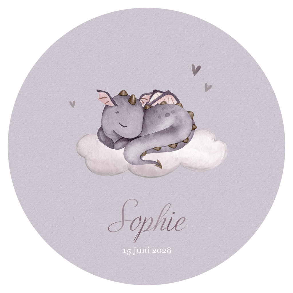 Lief geboortekaartje met slapend draakje op een wolkje op een lila ondergrond. De naam en de hartjes staan in hoogglans gedrukt. Kondig de komst van je dochter aan met dit ronde geboortekaartje. Pas het ontwerp zelf heel simpel aan in onze editor en bestel een proefdruk.