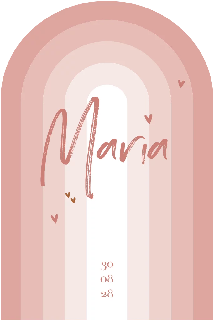 Geboortekaartje in de vorm van een regenboog ofwel arch met regenboog in roze tinten van licht naar donker. Je kunt de kleuren van de regenboog aanpassen met de editor, elke kleur kun je los aanklikken. De tekst en hartjes staan in donkerroze. Maak de kaart naar wens op en bestel een drukproef.