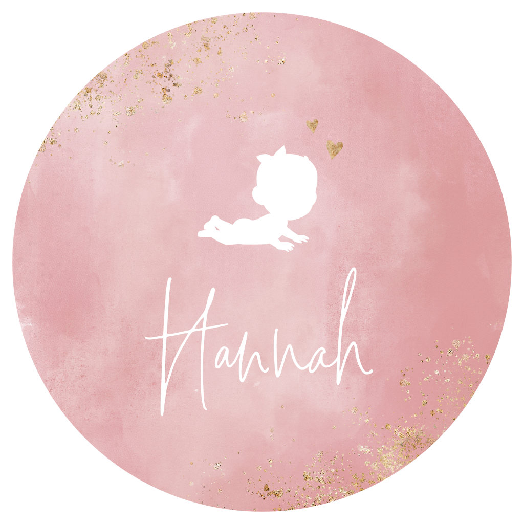 Roze rond geboortekaartje met silhouet van baby en goudlook hartjes
