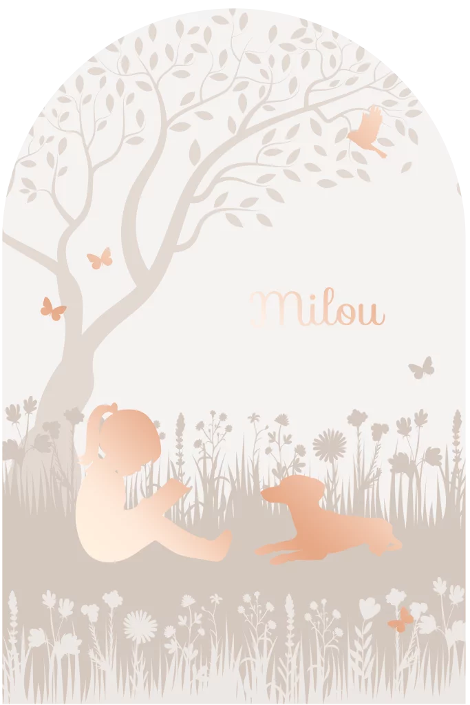 Kondig de komst van je prachtige dochter aan met dit betoverende geboortekaartje in halfronde vorm. De naam van je dochtertje komt boven een silhouet meisje, lezend onder de beschutting van een majestueuze boom, vergezeld door een lief hondje. Met bloemen in bloei, dansende vlindertjes en de belofte van ontluikend leven, straalt deze kaart warmte en verwondering uit voor dit nieuwe hoofdstuk in je leven. De naam, silhouetjes, vlindertjes en een vogeltje worden in glimmend koperfolie gedrukt, voor een extra bijzonder en feestelijk effect. Pas dit kaartje naar wens aan in onze editor.